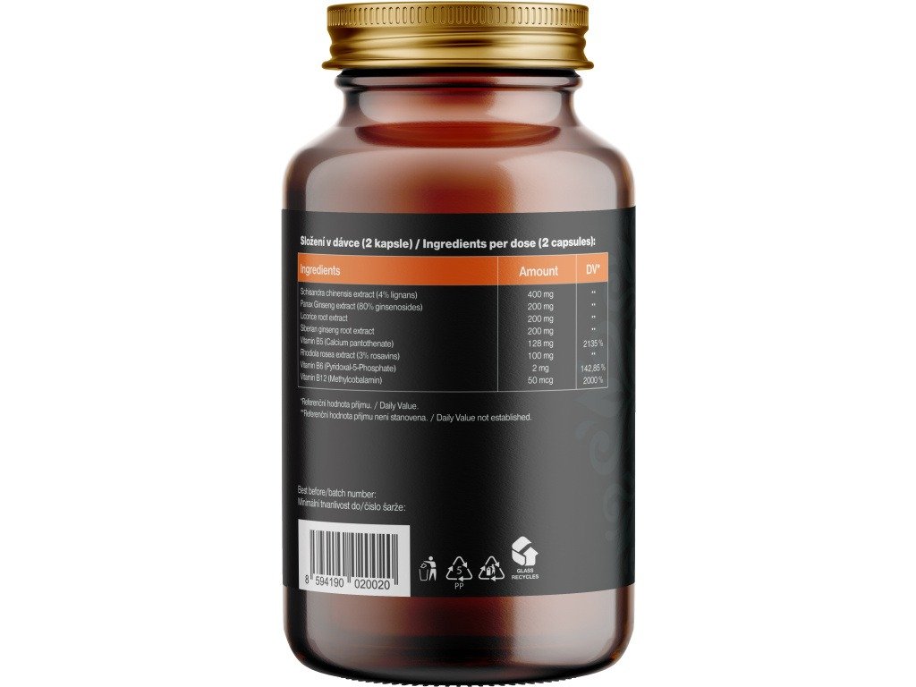Sastav: Schizandra kineska ekstrakt, Ekstrakt iz sibirskog ginsenga (80% ginsenozida), Ekstrakt iz korijena sladića, Ekstrakt iz korijena Eleuterokok (1% eleuterokoida), Vitamin B5 (panthein) Ekstrakt iz Rhodiola rosea (4% rosavina), vitamin B6 (Piridoksal 5-fosfat), vitamin B12 (metilkobalamin). Biljna kapsula na bazi HPMC. Bez sadržaja balastnih tvari. Pakiranje sadrži 60 biljnih kapsula. Prikladno za vegane.