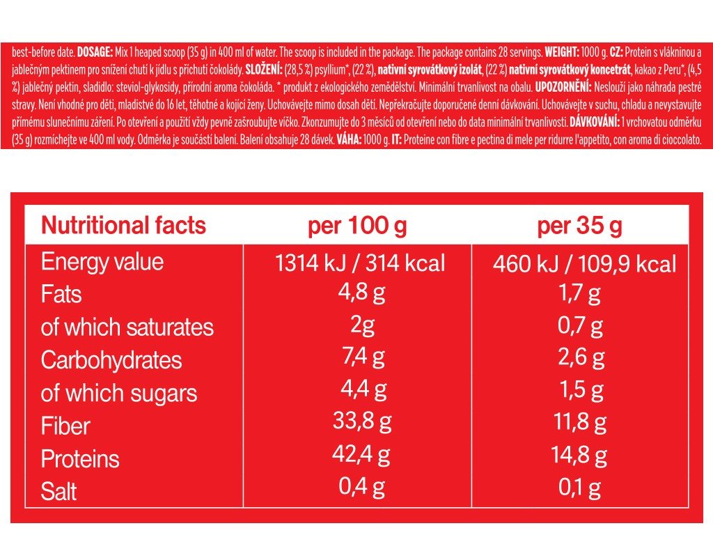 Sastav: (28,5 %) psyllium*, (22 %), izolat nativne sirutke, (22 %) koncentrat nativne sirutke, kakao iz Perua*, (4,5 %) jabučni pektin, sladilo: steviol-glikozidi, prirodna aroma čokolade. * proizvod iz ekološke poljoprivrede.
