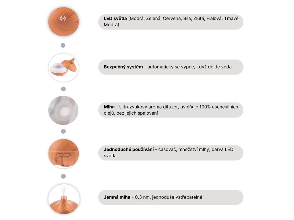 Mirisi imaju značajan utjecaj na našu psihu i raspoloženje, bilo u uredu ili kod kuće. Uz pomoć aroma difuzora, dan možete učiniti ugodnijim i uroniti u atmosferu mira i blagostanja. Ovaj difuzor ne samo da parfimira zrak, već zahvaljujući ultrazvučnim valovima također ovlažuje zrak , što doprinosi boljem disanju . Navečer možete sjesti, pustiti da se zrak ispuni ugodnom aromom i uživati u vizualnom efektu pozadinskog osvjetljenja u boji koji upotpunjuje cjelokupni doživljaj.