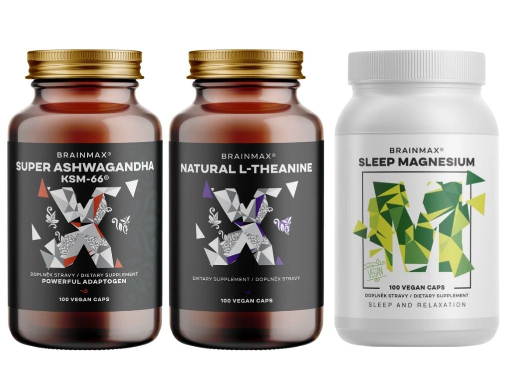 Legenda: Ašvaganda 1 , Magnezij 2 , L-teanin 3
