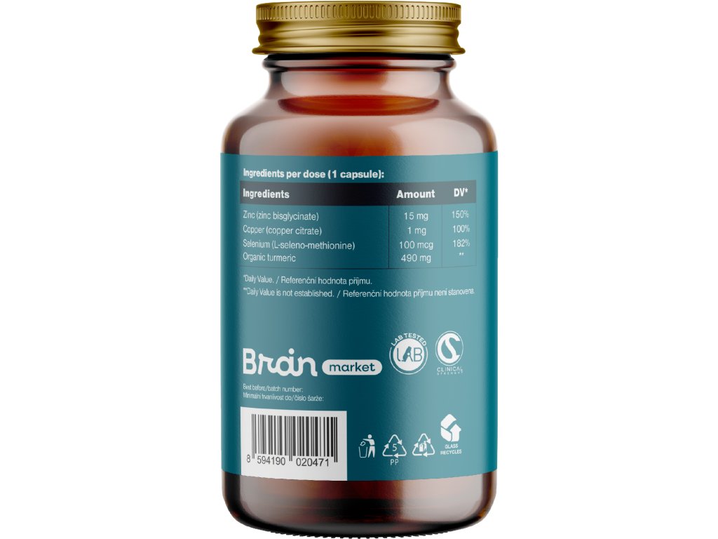 Sastojci: cinkov bisglicinat, bakrov citrat, L-selenometionin, organska kurkuma. Biljna kapsula na bazi HPMC-a. Ne sadrži balastne tvari (E).