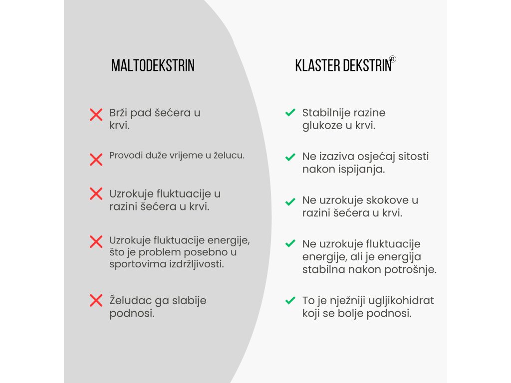 Cluster dextrin® je patentirani oblik polisaharida dizajniran prvenstveno za sportove izdržljivosti. Tehnološka obrada osigurava da se ne zadržava predugo u želucu i putuje do tankog crijeva, odakle se postupno oslobađa u krv. To ga čini izvrsnim pomagačem tijekom dugih i fizički zahtjevnih treninga, gdje nam je potrebna energija i snaga za dulje vrijeme. Može se koristiti prije, tijekom ili nakon treninga za popunjavanje zaliha glikogena.