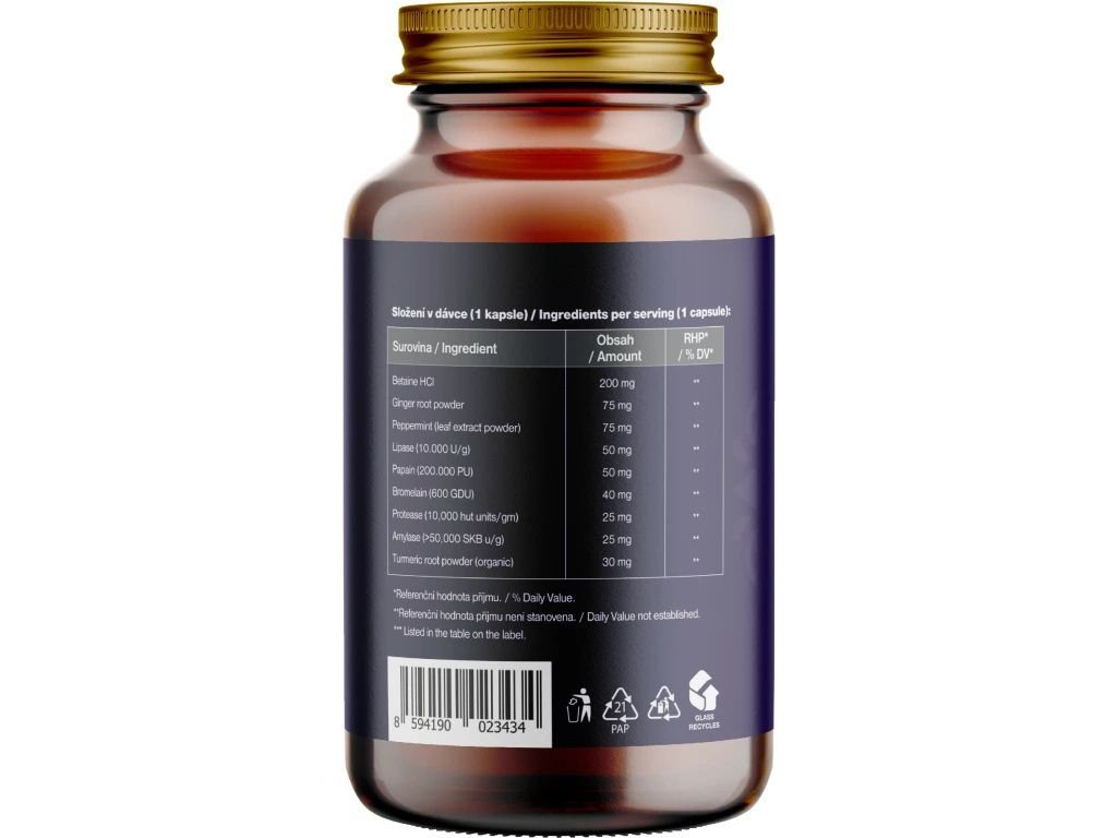 BrainMax Digestive Magic sadrži amilazu, koja razgrađuje škrobove i ugljikohidrate u šećere, proteazu, koja je zadužena za razgradnju proteina u aminokiseline, i lipazu, koja razgrađuje masti u glicerol i masne kiseline. Smjesa je obogaćena betainom, bromelainom i papainom (iz voća papaje ili ananasa), koji su prirodni probavni enzimi često korišteni za razgradnju proteina u prehrani. Enzime smo obogatili korijenom đumbira, kurkume i listovima mente, koji doprinose normalnoj probavi.