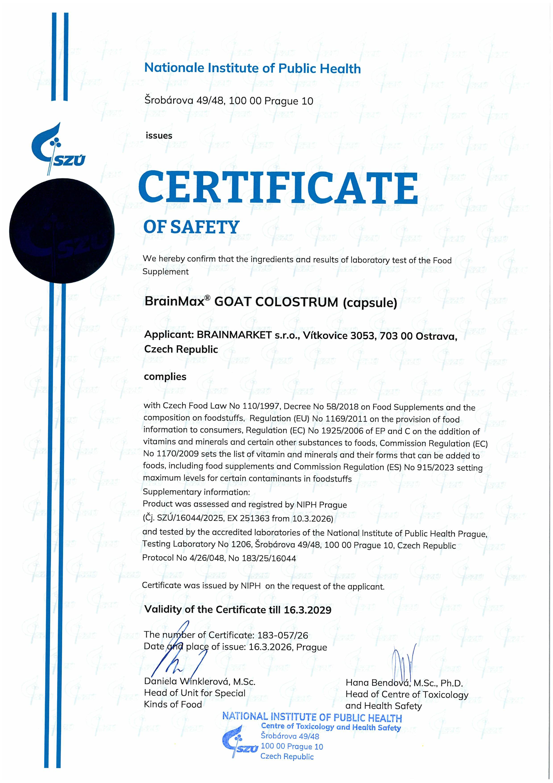 Sastav: kozje kolostrum, inulin. Sadrži mlijeko i laktozu. Proizvedeno u Češkoj Republici za tvrtku BRAINMARKET s.r.o.