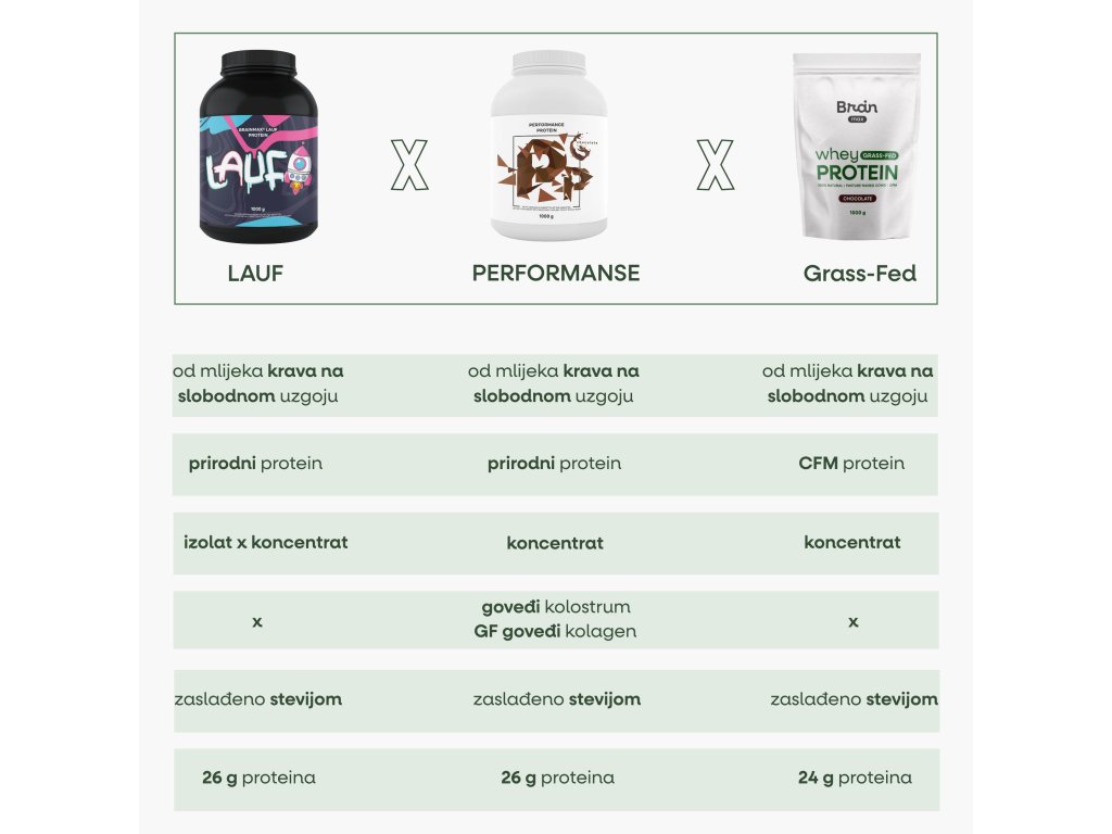 Nativni protein koji koristimo u Performance i LAUF proteinima dobiva se direktno iz svježeg mlijeka, dok klasični whey protein (kao u ovom proteinu) nastaje kao nusprodukt proizvodnje sira. Što to znači za kvalitetu? Praktično nema razlike ako se obrada vrši nježno. Zahvaljujući CFM metodi, naš "ne-nativni" protein zadržava vrlo sličan integritet, nedenaturaciju i visok sadržaj aminokiselina kao nativni protein. Ali CFM protein ima jednu veliku prednost - puniji, ukusniji profil okusa i izraženiji mliječni okus!