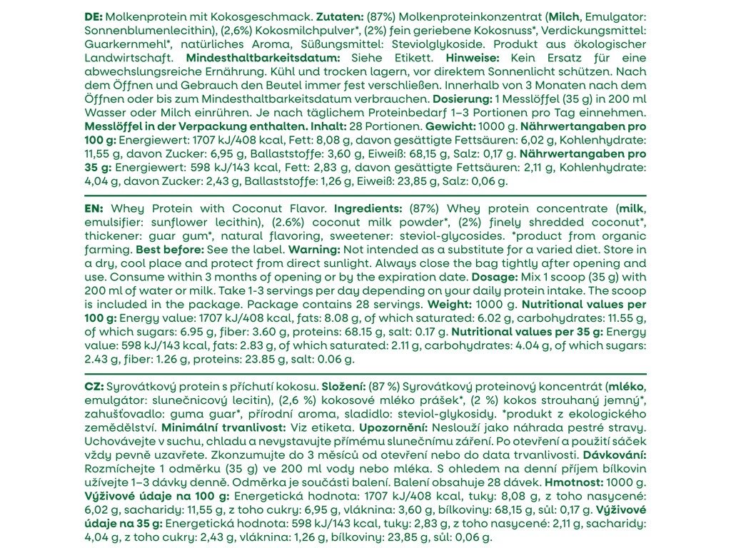 Sastojci: (87%) koncentrat proteina sirutke ( mlijeko , emulgator: suncokretov lecitin), (2,6%) kokosovo mlijeko u prahu*, (2%) sitno naribani kokos*, zgušnjivač: guar guma*, prirodna aroma, sladilo: steviol glikozidi. *proizvod iz organskog uzgoja.