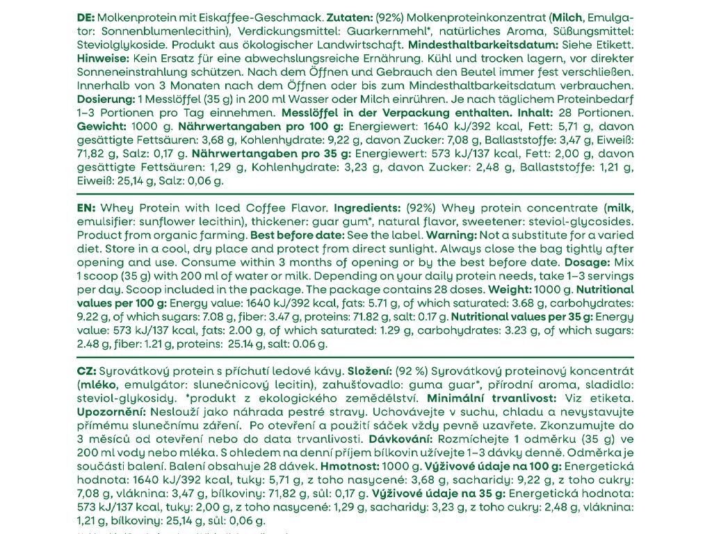 Sastav: (92 %) sirutkini proteinski koncentrat (mlijeko, emulgator: suncokretov lecitin), zgušnjivač: guar guma*, prirodna aroma, zaslađivač: steviol-glikozidi. *proizvod iz ekološke poljoprivrede.