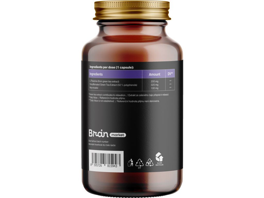 Sastojci: L-Theanin (iz ekstrakta zelenog čaja) (200 mg, NRV***), ekstrakt zelenog čaja bez kofeina (50% polifenola) (320 mg, NRV ***), mio-inozitol (100 mg, NRV***), biljna kapsula na bazi HPMC-a. Ne sadrži balastne tvari (E).