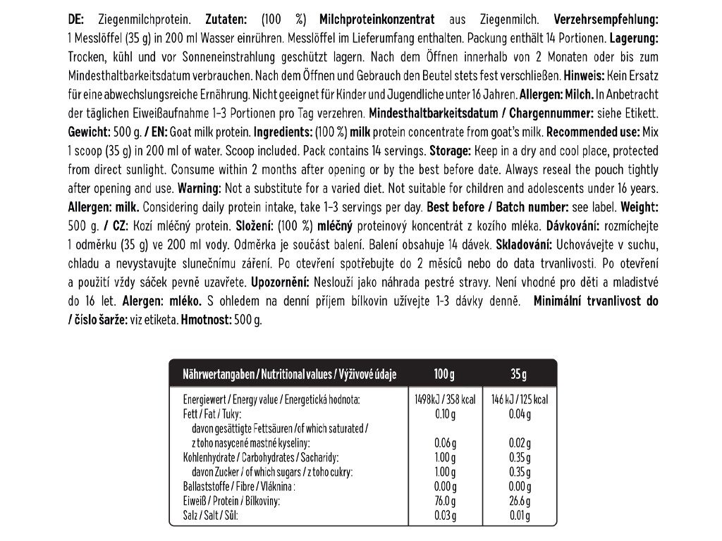 Sastav: (100 %) koncentrat mliječnog proteina iz kozjeg mlijeka. Alergen: mlijeko.