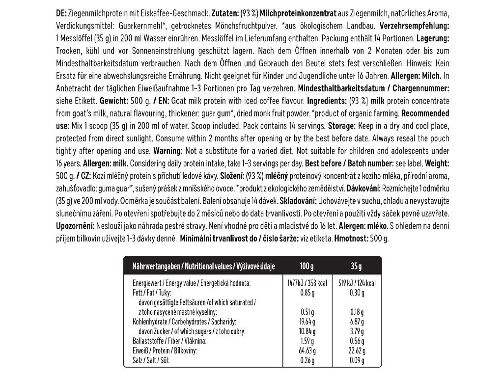Sastav: (93 %) koncentrat mliječnog proteina od kozjeg mlijeka, prirodna aroma, zgušnjivač: guar guma*, sušeni prah od redovničkog voća. *proizvod iz ekološke poljoprivrede. Alergen: mlijeko.