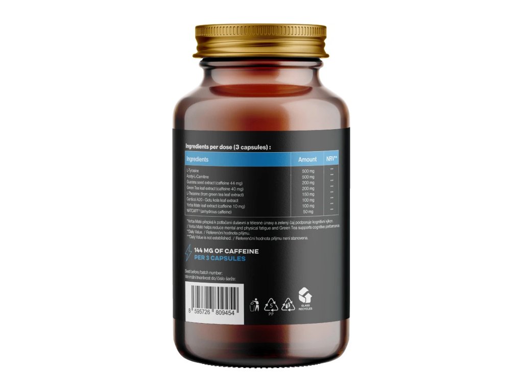 Sastojci: L-Tirozin (500 mg, DRV **), Acetil-L-karnitin (500 mg, DRV **), Ekstrakt sjemenki guarane (200 mg, od čega kofein 44 mg, DRV *), Ekstrakt zelenog čaja (200 mg, od čega kofein 40 mg, DRV *), L-Teanin (iz ekstrakta lista zelenog čaja) (150 mg, DRV *). Ekstrakt Gotu kole (Centella asiatica) kao Centicol A20 (100 mg, DRV *), Ekstrakt lista Yerba Mate (100 mg, od čega kofein 10 mg, DRV *), NATCAFF® bezvodni kofein (50 mg, DRV *).