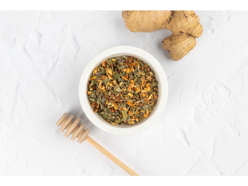 Sastojci: Jabuka*, đumbir*, kora od narandže*, metvica*, lišće eukaliptusa*, listovi kadulje*, cvjetovi bazge*, aromati. *proizvod iz organskog uzgoja. Minimalni rok trajanja (broj serije) na dnu. Čuvati na hladnom i suhom mjestu i ne izlagati izravnoj sunčevoj svjetlosti.
