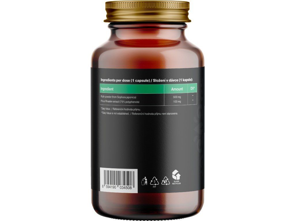 Sastav: rutin prah (iz Sophora Japonica), ekstrakt morske borovnice. Biljna kapsula na bazi HPMC. Bez sadržaja balastnih tvari.