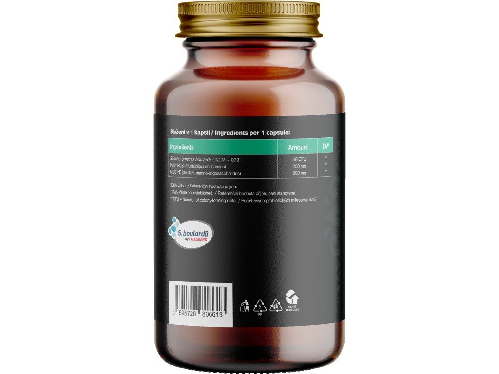 Sastav: Saccharomyces boulardii CNCM I-1079 (5 mlrd CFU, NRV **), Inulin-FOS (fruktooligosaharidi) (250 mg, NRV **), MOS – manno-oligosaharidi (35–45 %) iz kvasnog ekstrakta (200 mg, NRV **). Biljna kapsula na bazi HPMC. Bez balastnih tvari. Ne sadrži laktozu ni mlijeko.