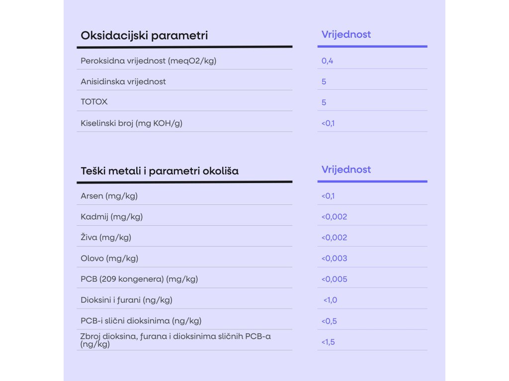 - Za sve koji žele imati sigurnost najviše kvalitete – naše omega 3 imaju jedne od najnižih vrijednosti oksidacije na tržištu i testirane su na prisutnost teških metala i drugih nečistoća