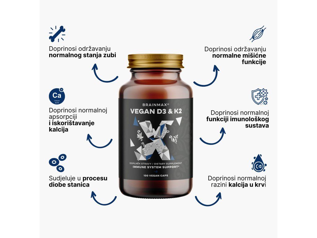BrainMax Vitamin D3 & K2 kombinira vitamine D3 i K2, dvije mikronutrijenata koje su opsežno proučavane zbog svoje uloge u zdravlju kostiju, zubi i imunitetu. Vitamin D3 doprinosi normalnom apsorpciji kalcija, a vitamin K2 doprinosi održavanju normalnog stanja kostiju i sudjeluje u pravilnoj funkciji zgrušavanja krvi. Vitamin D3 je 100% biljnog podrijetla i pogodan za vegane.
