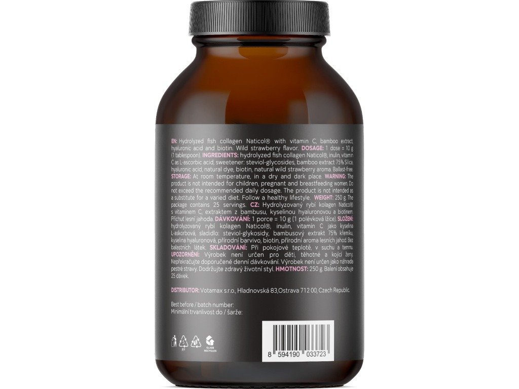 BrainMax Beauty Collagen sadrži patentirani oblik kolagena. Naticol® se ekstrahira iz ribe, a zatim prolazi kroz jedinstveni proces, koji je podijeljen u 2 koraka: ekstrakciju kolagena nakon koje slijedi enzimska hidroliza, zahvaljujući kojoj ima najmanju molekularnu težinu, a bioaktivni peptidi mogu prodrijeti u puno većoj mjeri u Stanice. Dakle, u usporedbi s bilo kojim uobičajenim hidroliziranim kolagenom, značajno povećava prodiranje i koncentraciju kolagena u koži, kosi ili noktima. Jedan je od najboljih dodataka prehrani u području njege kože. Istraživanje je pokazalo da upotreba 5 g Naticola ® kolagen (1 doza Beauty Collagena) tijekom 8 tjedana, poboljšana elastičnost kože i izgled bora na licu.1 Naticol-5g-studija