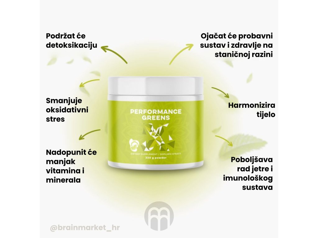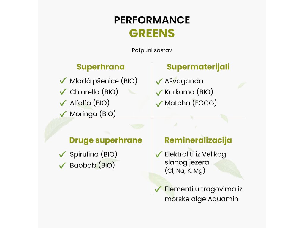 Performance Greens® je mješavina super zelenih biljaka za podršku prirodnoj obrambenoj sposobnosti2, normalnoj razini šećera u krvi2, vitalnosti2, stvaranju hemoglobina2, pridonosi mentalnom zdravlju i ravnoteži2, pridonosi normalnoj razini glukoze u krvi7 i zahvaljujući keltskoj soli i koncentratu iz Velikog Solnog jezera također dozama minerala. Osim zelenih superhrana, sadrži i ashwagandhu.