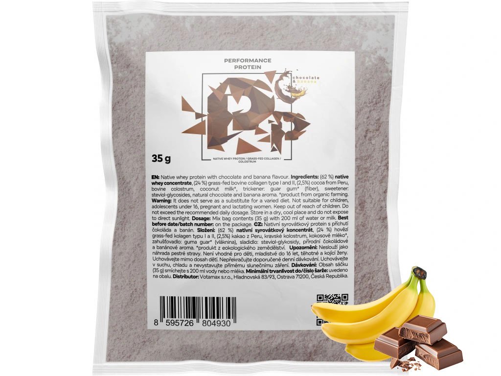Performance protein, nativni protein sirutke, čokolada i banana, 30 g Nativni protein sirutke s kolostrumom i kolagenom, dodatak prehrani