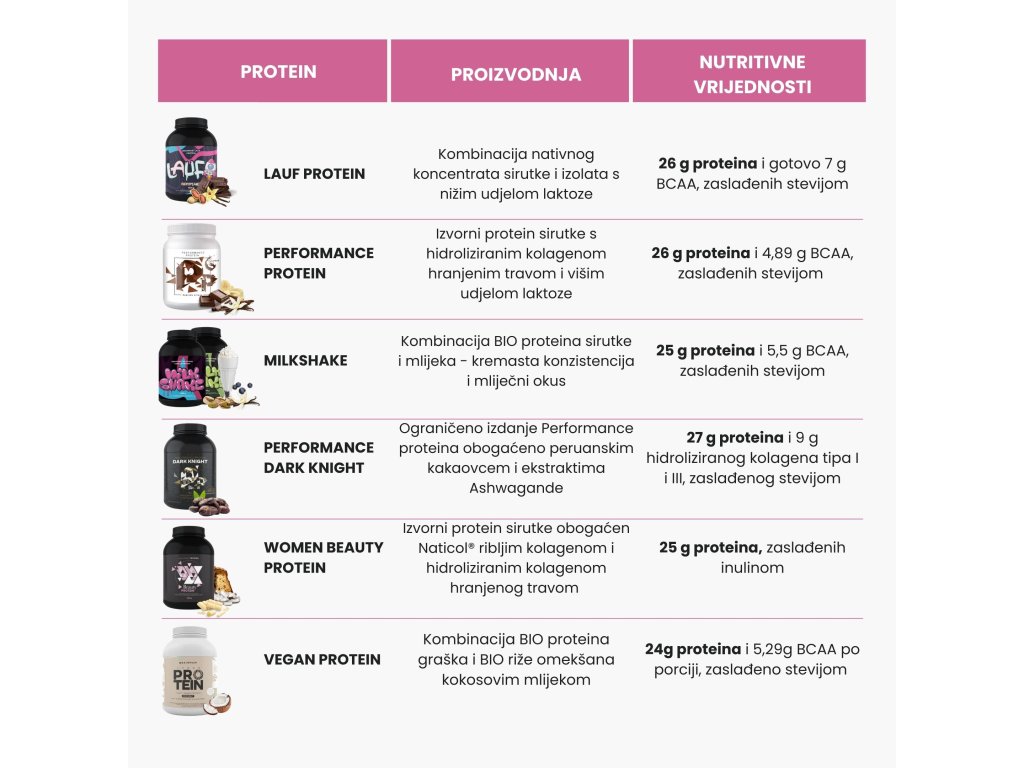 I LAUF i Performance Protein® sadrže najkvalitetniji prirodni protein sirutke. LAUF se temelji na 100% prirodnom proteinu u obliku izolata i koncentrata u omjeru 1:1. Performance Protein® kombinira 62% prirodnog proteina sirutke s 26% hidroliziranog kolagena od životinja slobodnog uzgoja te je dodatno obogaćen kravljim kolostrumom i kokosovim mlijekom. Dok je LAUF prvenstveno usmjeren na čistu i učinkovitu suplementaciju proteinima nakon sportskih performansi, Performance Protein® nudi širu funkcionalnu upotrebu - prikladan je ne samo nakon treninga, već i kao dio dnevne prehrane s naglaskom na raznolikost sastojaka.